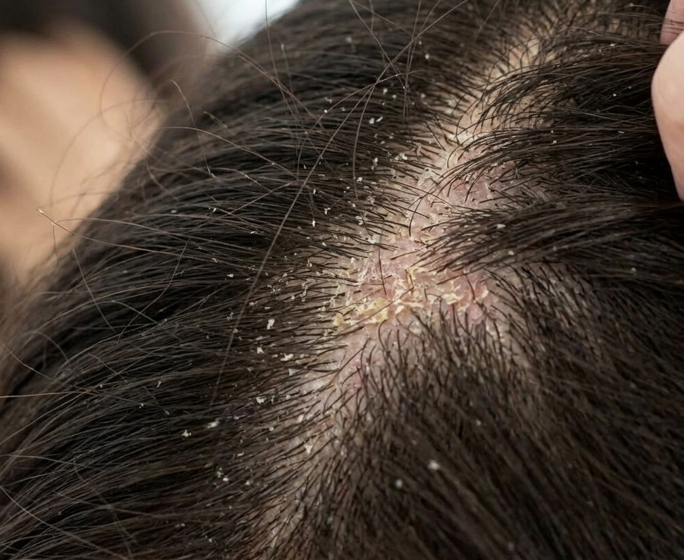 Descamación seca — escamas pequeñas, blancas y finas que se desprenden fácilmente. El cuero cabelludo se siente tirante y a veces con picor. Suele estar relacionada con sequedad, falta de hidratación o sensibilidad.